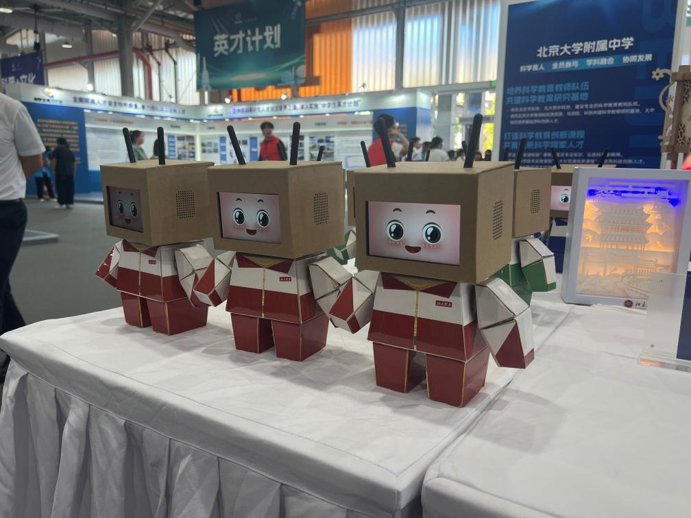 北京大學(xué)附屬中學(xué)的同學(xué)們帶來(lái)了他們研發(fā)制作的舞蹈紙殼機器人。這些身著(zhù)校服的瓦楞紙機器人一邊喊出“少年強則國強”,一邊做著(zhù)律動(dòng)。