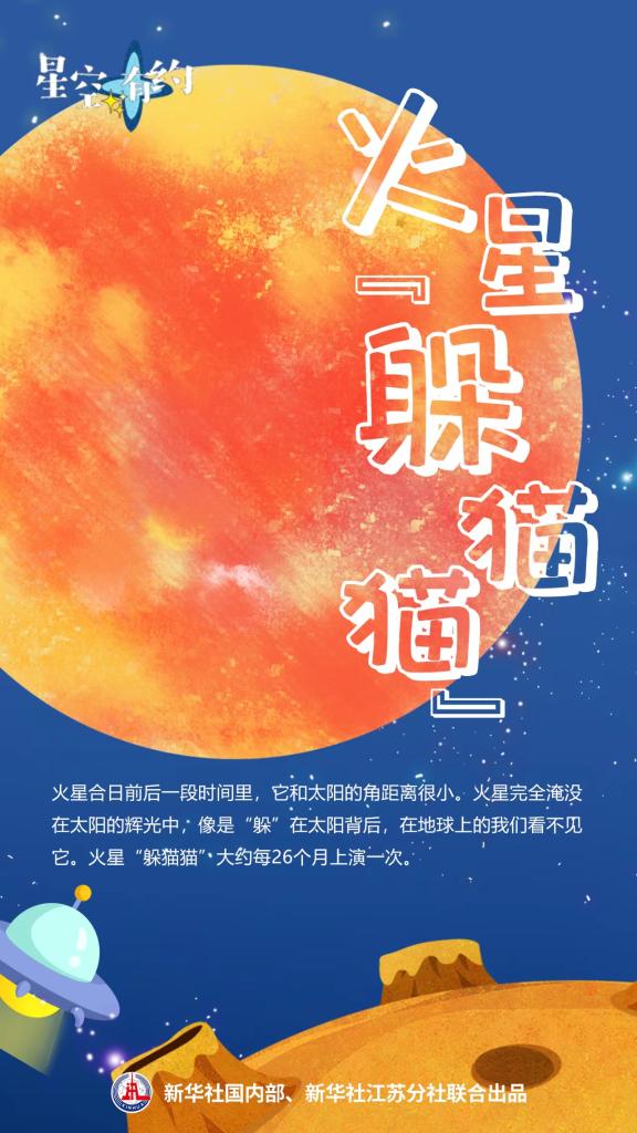 中國科學(xué)院紫金山天文臺科普主管王科超介紹,地球和火星都圍繞太陽(yáng)公轉,火星和太陽(yáng)的地心視黃經(jīng)相同時(shí),稱(chēng)作火星合日。這時(shí),地球和火星分別運行到太陽(yáng)兩側,三者幾乎成一條直線(xiàn),從地球上看不見(jiàn)火星。