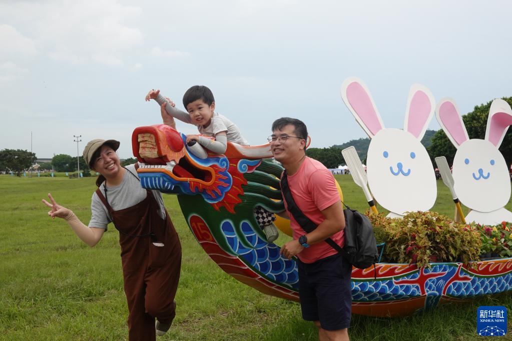 6月22日,民眾在臺北市大佳河濱公園的端午龍舟裝飾前合影留念。新華社記者 尚昊 攝