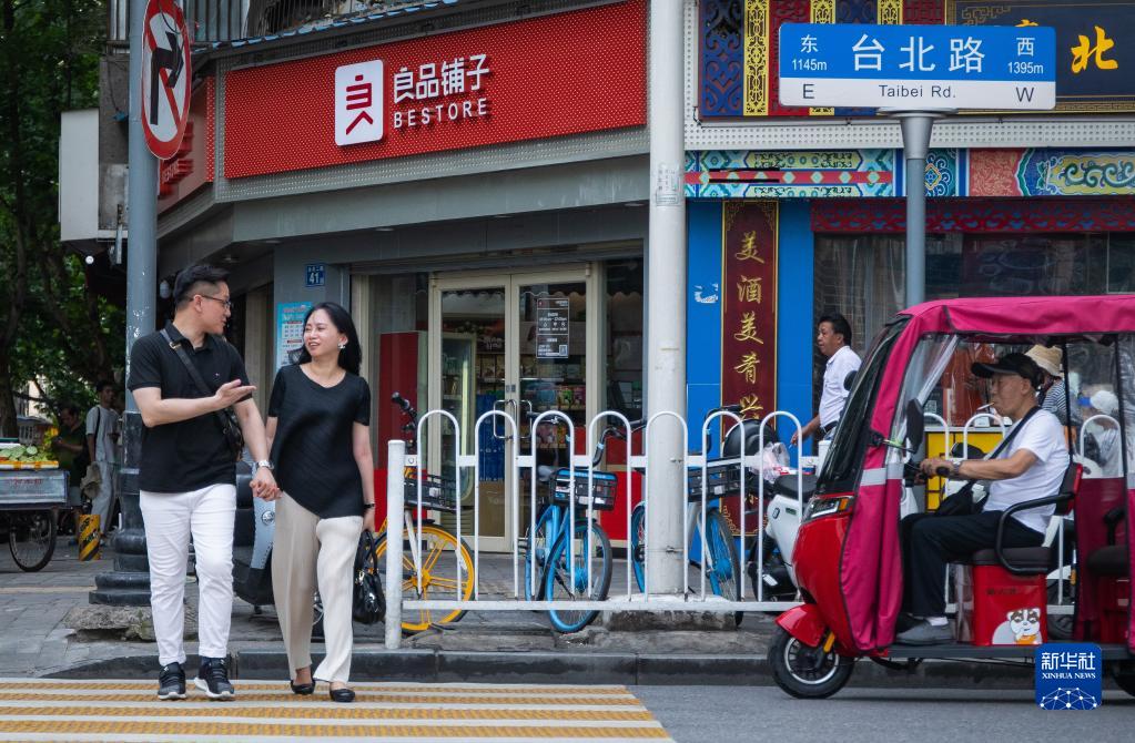 7月2日,臺灣青年張立綸和妻子走在武漢市臺北路上。新華社記者 饒饒 攝