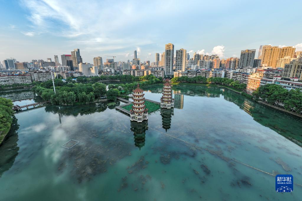 7月3日拍攝的武漢市寶島公園湖心島上的“龍虎塔”(無(wú)人機照片)。新華社記者 伍志尊 攝