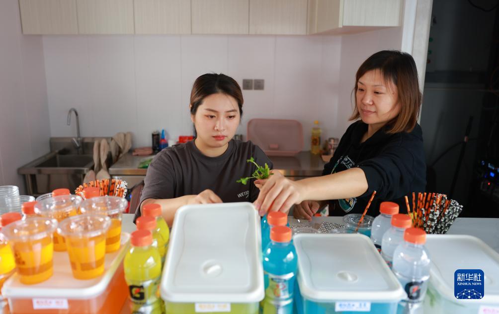 在天津市西青區一處滑板公園,戴瑋萱(左)為即將到來(lái)的滑板愛(ài)好者準備飲品(10月28日攝)。新華社記者 孫凡越 攝