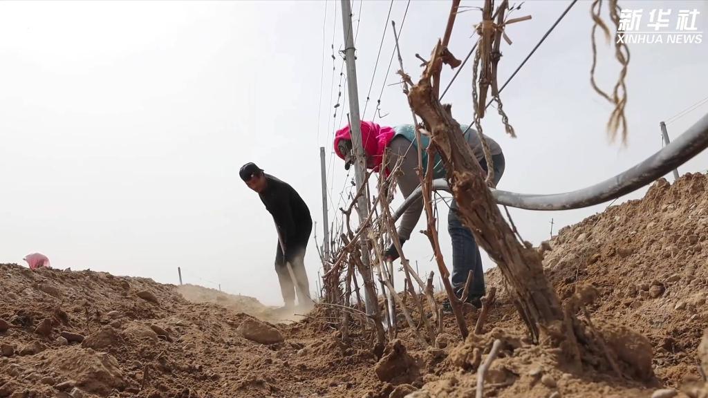 目前,寧夏賀蘭山東麓葡萄酒產(chǎn)區正在開(kāi)展展藤工作。