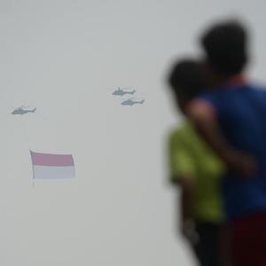 8月17日,人們注視著(zhù)懸掛印度尼西亞國旗的直升機飛過(guò)雅加達上空。8月17日是印度尼西亞獨立日。新華社發(fā)(祖卡南攝)