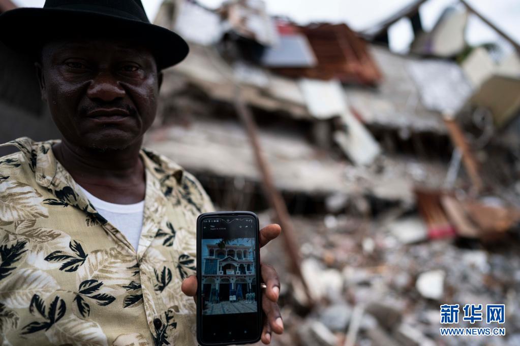 8月17日,海地萊凱一名男子在房屋廢墟前展示該房屋倒塌前的樣子。