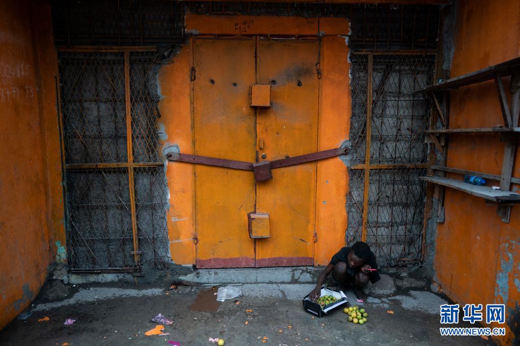 8月17日,一名男子在海地萊凱一個(gè)緊閉的門(mén)前挑揀水果。