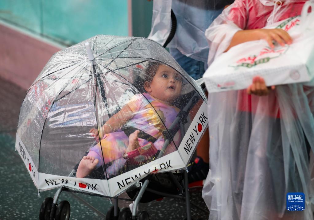 這是8月22日在美國紐約時(shí)報廣場(chǎng)拍攝的雨中罩在傘下的一名女孩。受熱帶風(fēng)暴“亨利”影響,美國紐約當日迎來(lái)降雨天氣。新華社記者 王迎 攝