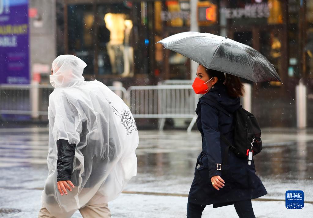 8月22日,人們行走在雨中的美國紐約時(shí)報廣場(chǎng)上。受熱帶風(fēng)暴“亨利”影響,美國紐約當日迎來(lái)降雨天氣。新華社記者 王迎 攝