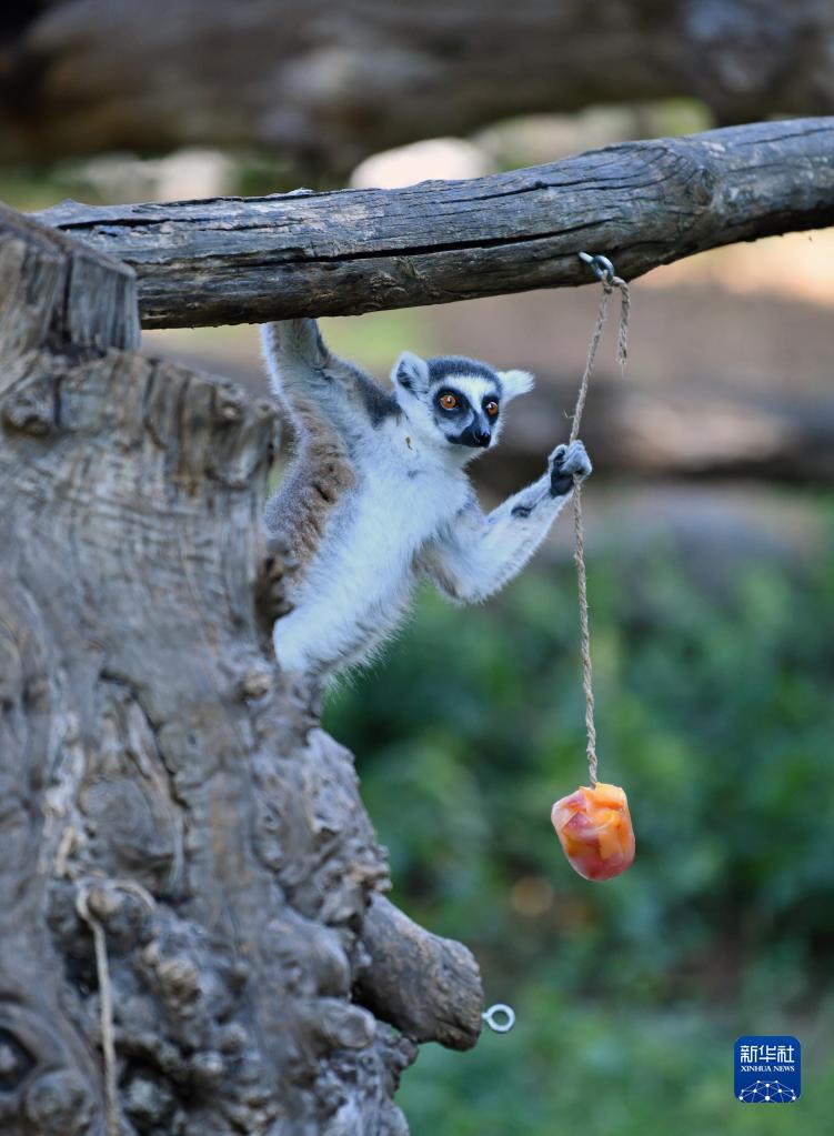 8月26日,一只環(huán)尾狐猴在意大利羅馬動(dòng)物園準備享用冰凍果蔬。