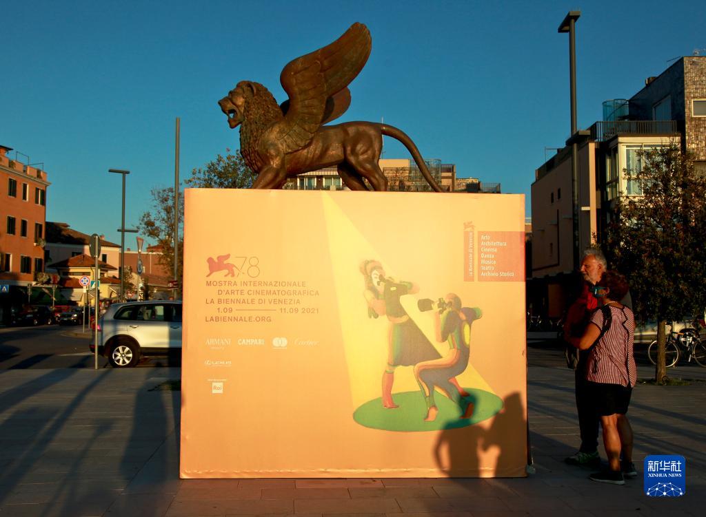 9月1日,在意大利威尼斯利多島,人們閱讀第78屆威尼斯國際電影節的海報。