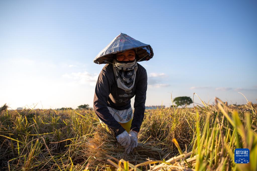 10月25日,農民在老撾萬(wàn)象城邊的田地里收割稻谷。