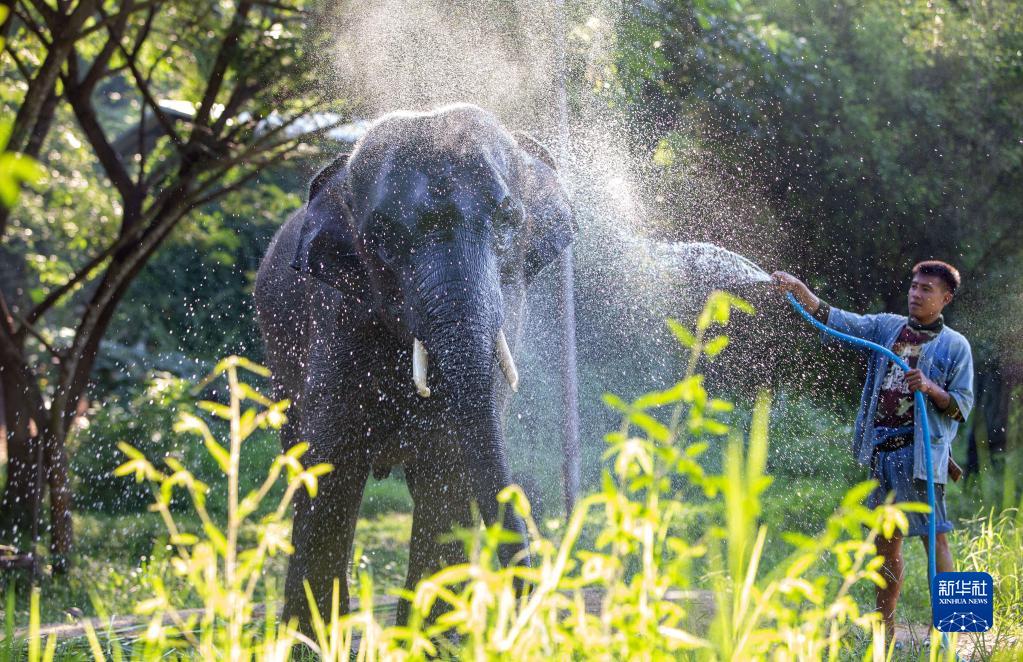 10月27日,工作人員在泰國南邦府的大象保護中心給大象洗澡。