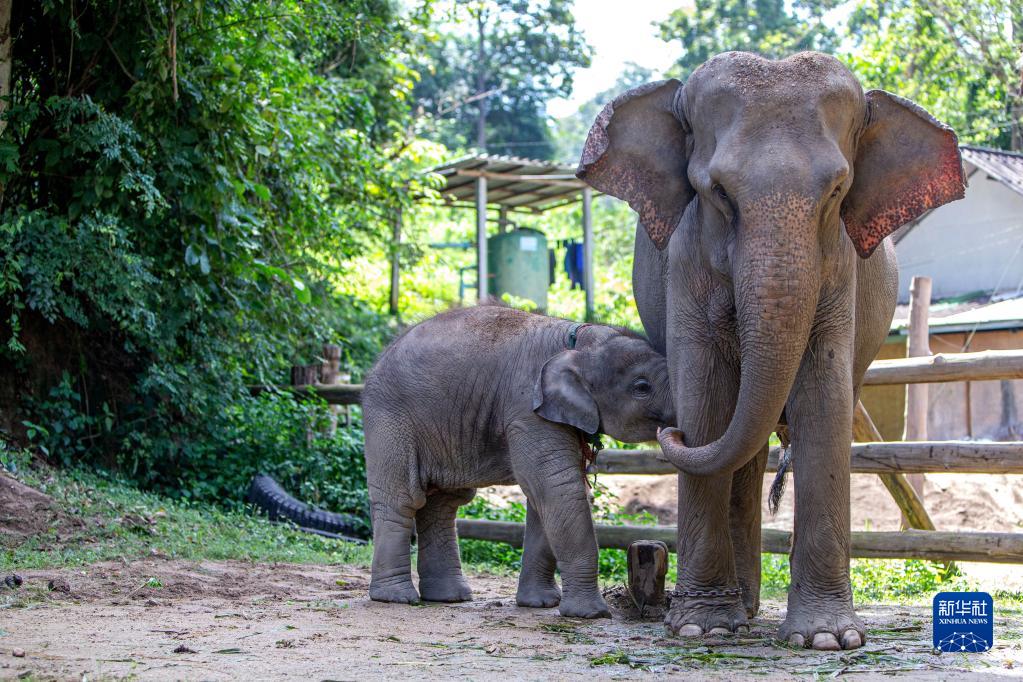 10月27日,在泰國大象保護中心,一頭小象和母象站在一起。