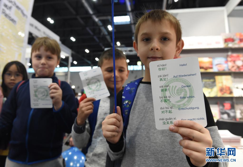 11月11日,孩子們在奧地利維也納書(shū)展的維也納大學(xué)孔子學(xué)院展臺前展示學(xué)習漢語(yǔ)小卡片。