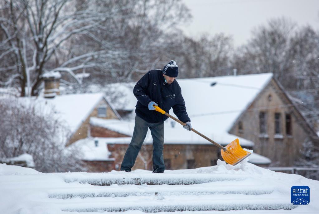 12月1日,一名男子在拉脫維亞里加鏟雪。
