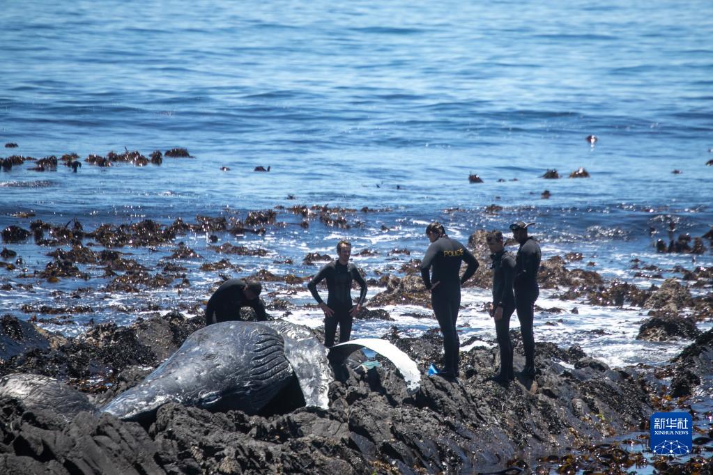 12月9日,在南非開(kāi)普敦,工作人員準備轉移海岸邊的座頭鯨尸體。