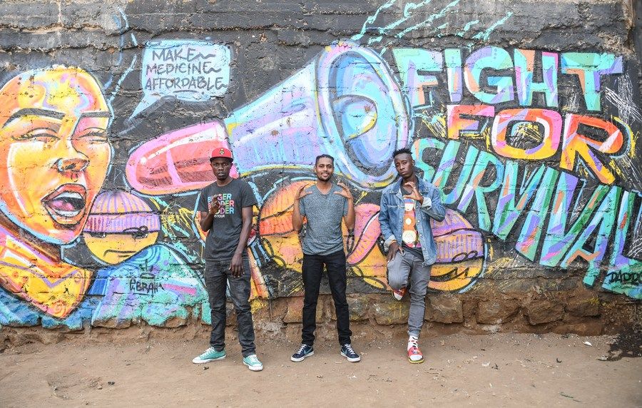 ↑2021年7月27日,“賽普勒斯”樂(lè )隊成員在肯尼亞首都內羅畢的馬薩雷貧民窟的一面涂鴉墻前擺出樂(lè )隊的代表性手勢。