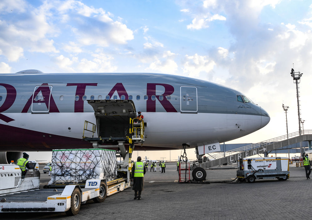 ↑2021年9月18日,在肯尼亞首都內羅畢,機場(chǎng)工作人員從飛機上卸下中國政府援助的新冠疫苗。