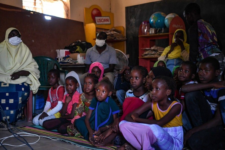 ↑2021年11月22日,在塞內加爾達喀爾近郊的辛迪亞小學(xué),同學(xué)們坐在教室的地毯上觀(guān)看投影播放的動(dòng)畫(huà)片。整套設備都是靠太陽(yáng)能蓄電池供電。