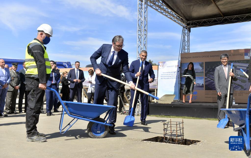 2021年9月9日,在塞爾維亞貝爾格萊德,塞爾維亞總統武契奇(中)為中國疫苗工廠(chǎng)奠基。當日,歐洲地區首家中國疫苗工廠(chǎng)奠基儀式在貝爾格萊德舉行。