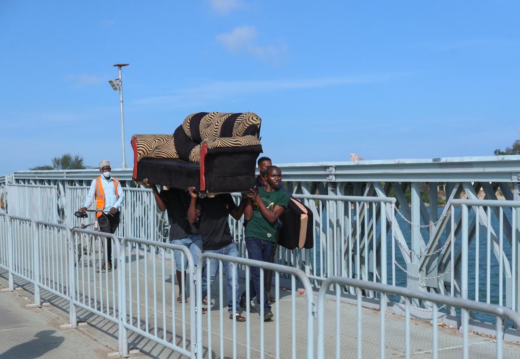 2022年1月4日,在肯尼亞蒙巴薩,當地居民在利科尼浮橋上通行。新華社記者龍雷攝