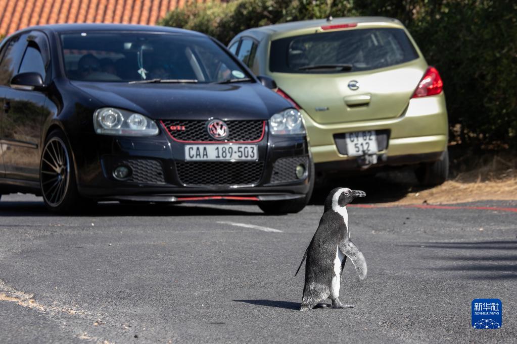 2月5日,一只非洲企鵝站在南非西蒙鎮的街道上。