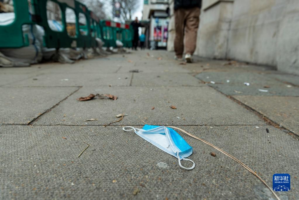 2月21日,在英國倫敦,一個(gè)口罩被丟棄在街上。