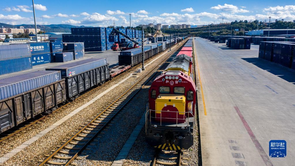 2022年1月1日,滿(mǎn)載30個(gè)標準集裝箱的中老鐵路新年首趟國際貨物列車(chē)??吭谥需F聯(lián)集昆明中心站(無(wú)人機照片)。新華社記者 胡超 攝