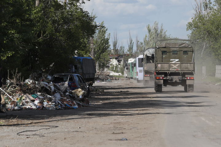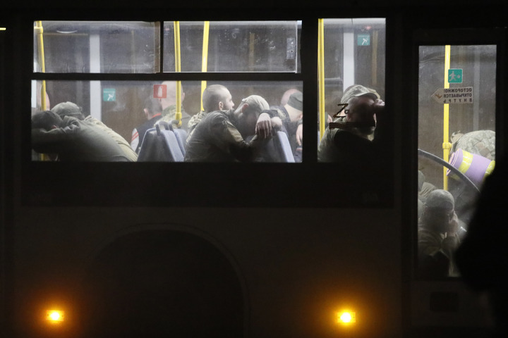 5月20日,載著(zhù)烏克蘭武裝人員的巴士抵達俄軍控制的奧列尼夫卡鎮。(新華社發(fā),維克托攝)