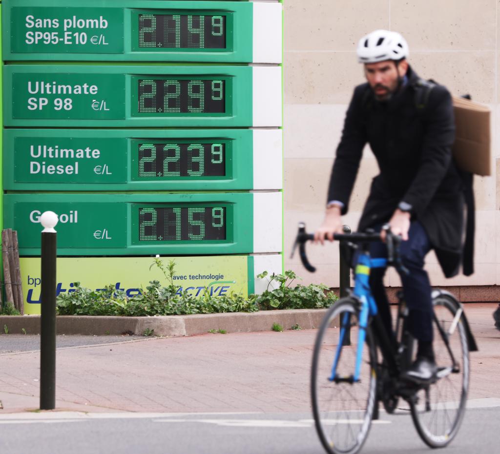 3月16日,一名男子騎車(chē)經(jīng)過(guò)法國巴黎一處加油站。(新華社記者高靜攝)
