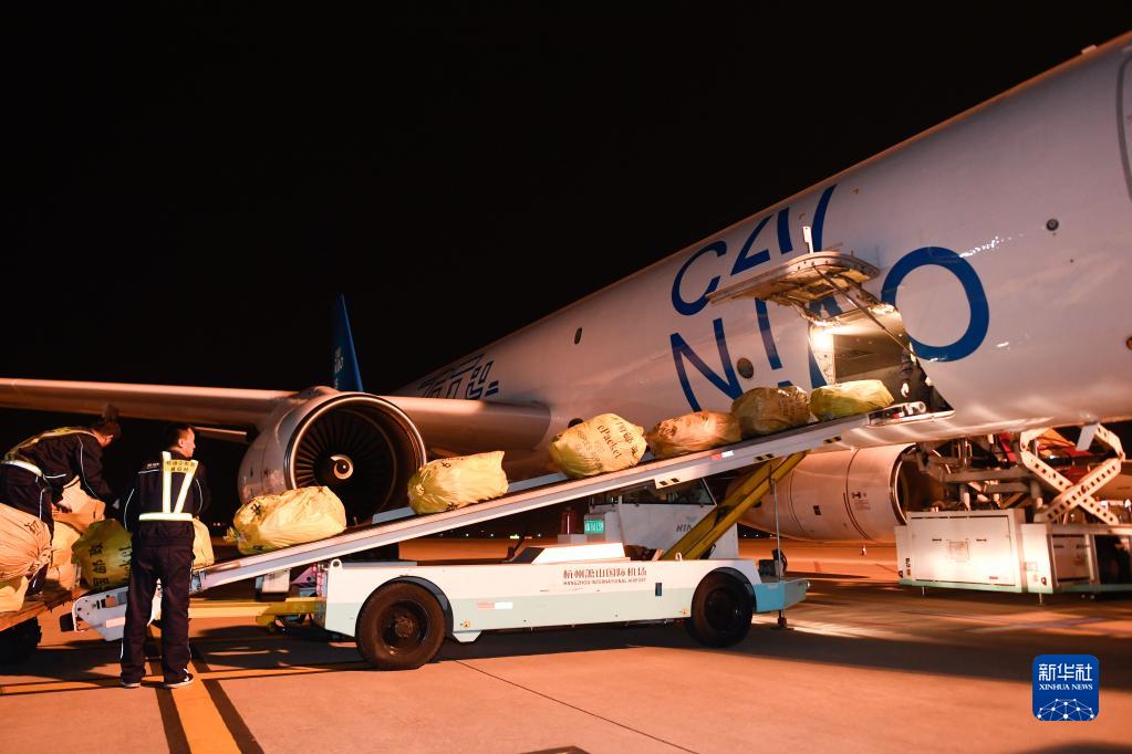 2019年10月30日凌晨,浙江杭州飛往俄羅斯首都莫斯科的首條直達電商貨運航線(xiàn)“菜鳥(niǎo)號”從蕭山國際機場(chǎng)首航。新華社記者 黃宗治 攝