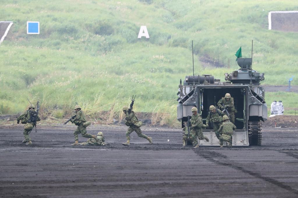 2018年8月26日,在日本靜岡縣東富士演習場(chǎng),日本陸上自衛隊舉行富士綜合火力演習。圖為水陸兩用車(chē)在演習中卸下自衛隊成員。新華社記者杜瀟逸攝