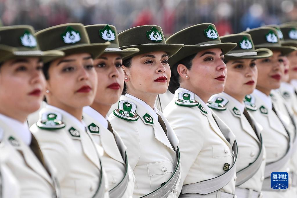9月19日,在智利首都圣地亞哥,女憲兵在閱兵式上列隊行進(jìn)。