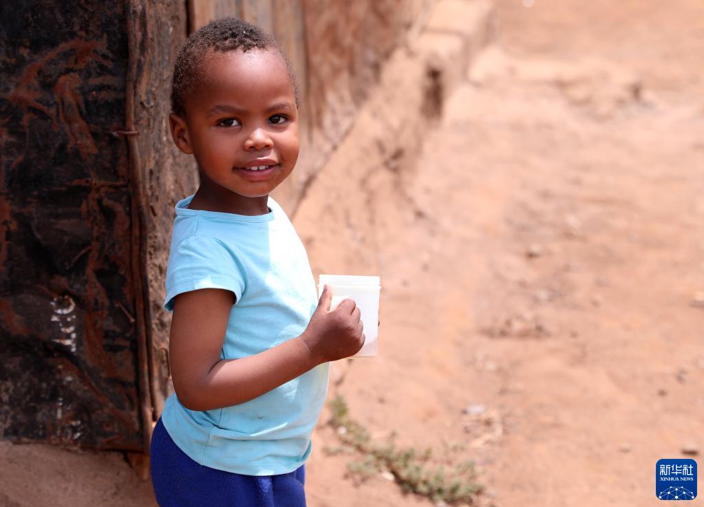 11月10日,一個(gè)孩子手握水杯站在肯尼亞基姆卡的一座幼兒園內。