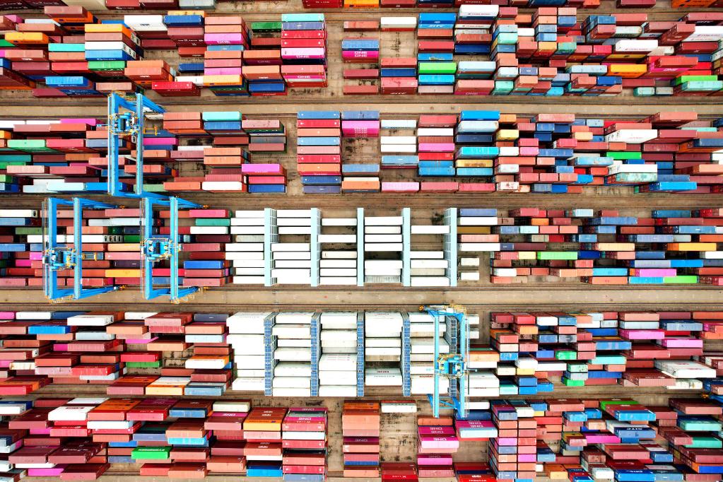 6月9日拍攝的山東港口青島港外貿集裝箱碼頭集裝箱堆場(chǎng)(無(wú)人機照片)。新華社發(fā)(俞方平攝)