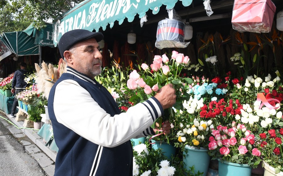 2022年12月29日,突尼斯首都突尼斯市中心一處花市的店主向顧客展示鮮花。新華社發(fā)(阿代爾攝)