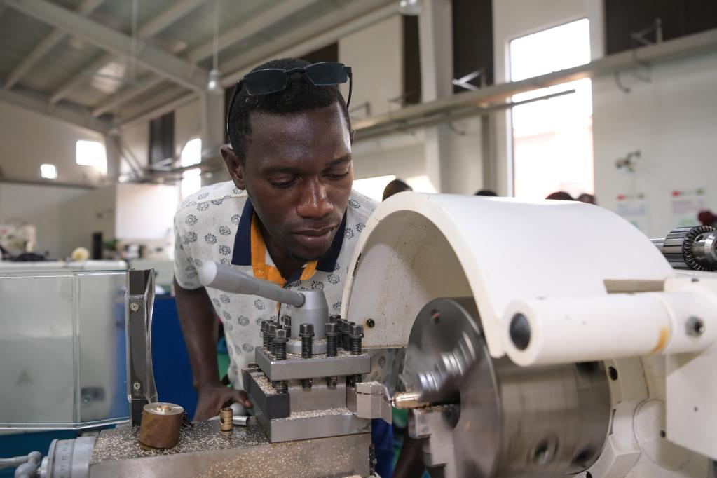 1月10日,在加蓬首都利伯維爾的恩考克經(jīng)濟特區,恩考克國際職業(yè)教育和培訓中心的學(xué)生進(jìn)行車(chē)削加工操作訓練。新華社記者韓旭攝