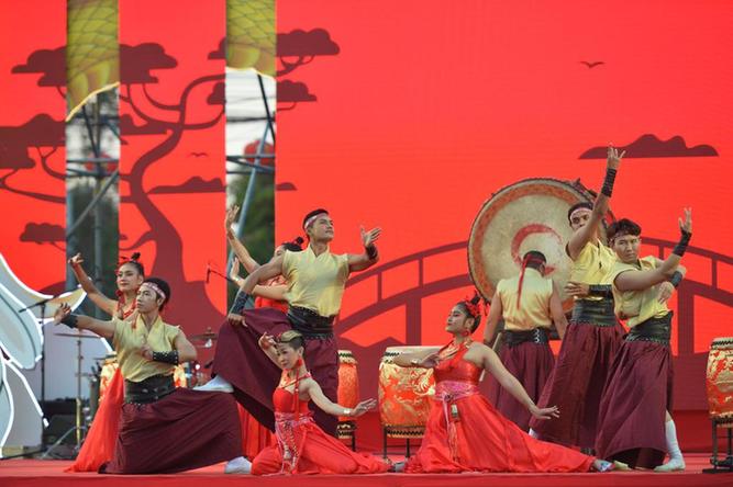 1月19日,在泰國叻武里府,演員在春節慶?;顒?dòng)上表演。新華社發(fā)(拉亨攝)