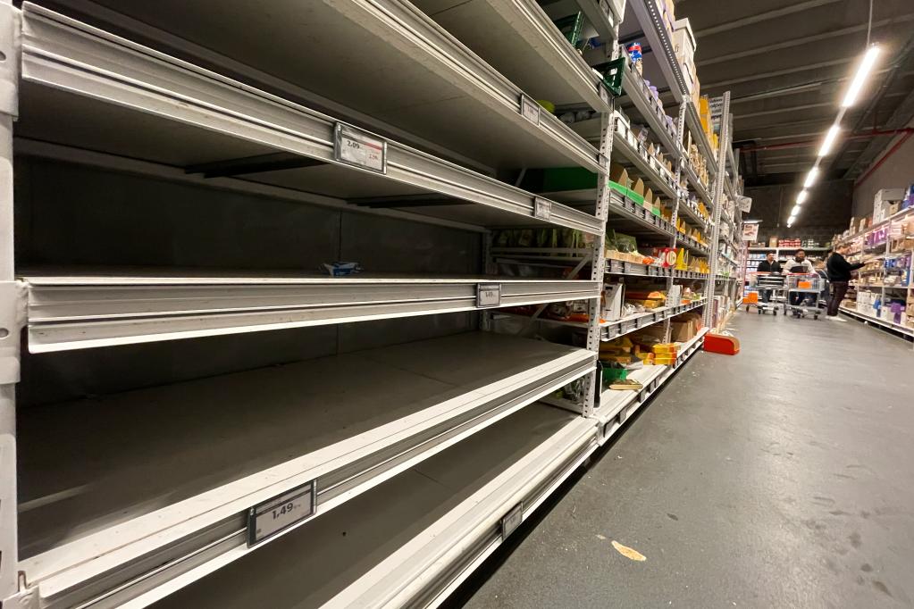 2022年10月31日,比利時(shí)布魯塞爾一家超市售賣(mài)平價(jià)雞蛋的貨架空空如也。(新華社記者鄭煥松攝)