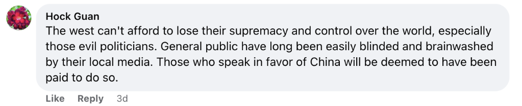 馬來(lái)西亞網(wǎng)友關(guān)霍克說(shuō):“西方不能失去對世界的霸權和控制,尤其是那些邪惡的政客。長(cháng)期以來(lái),公眾很容易被西方媒體蒙蔽和洗腦。”