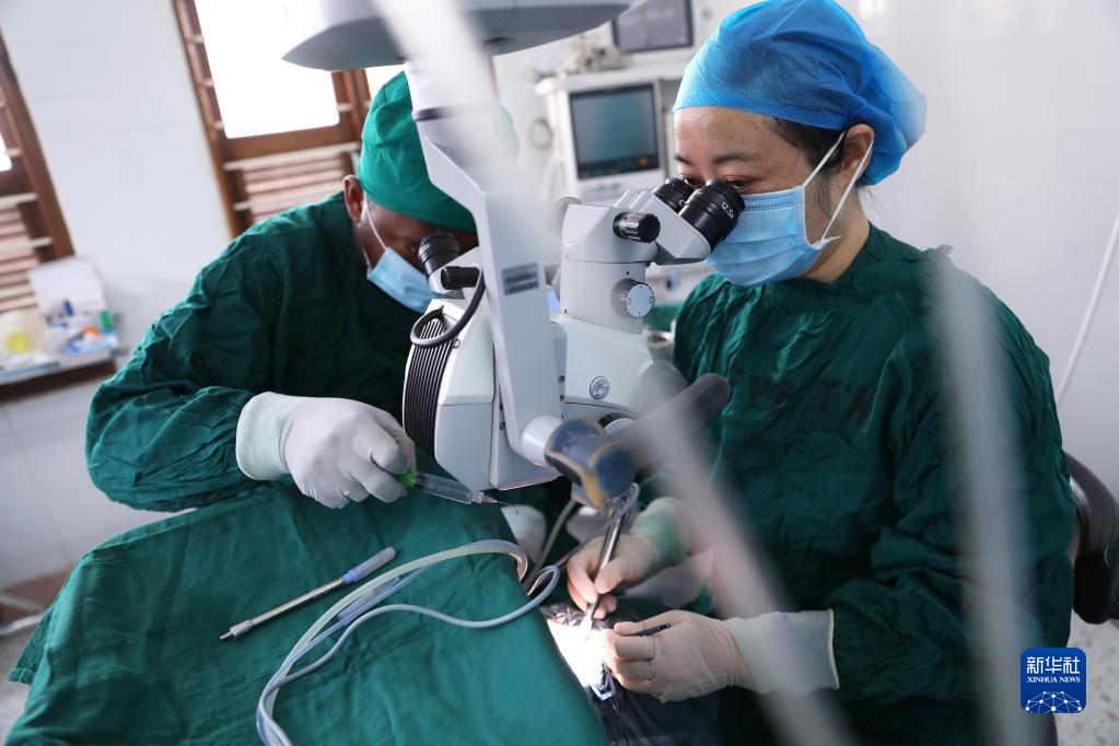 2月23日,在坦桑尼亞桑給巴爾島納茲莫加醫院,眼科醫生董莉莉(右)給病人做白內障超聲乳化摘除手術(shù)。