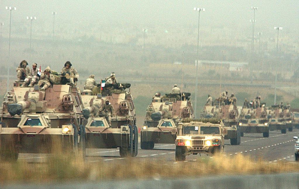 2003年3月25日,美軍幾十輛裝甲車(chē)輛從科威特城駛向科威特與伊拉克邊境。新華社記者 李曉果 攝
