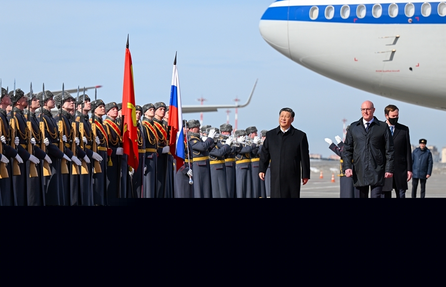 當地時(shí)間3月20日,國家主席習近平乘專(zhuān)機抵達莫斯科,應俄羅斯總統普京邀請,對俄羅斯進(jìn)行國事訪(fǎng)問(wèn)。下午1時(shí)許,習近平乘坐的專(zhuān)機抵達莫斯科伏努科沃專(zhuān)機機場(chǎng)。習近平步出艙門(mén)時(shí),俄羅斯副總理切爾內申科等政府高級官員在舷梯旁熱情迎接。俄方在機場(chǎng)舉行隆重迎賓儀式。軍樂(lè )團奏中俄兩國國歌。這是習近平檢閱俄羅斯三軍儀仗隊并觀(guān)看分列式。新華社記者 謝環(huán)馳 攝