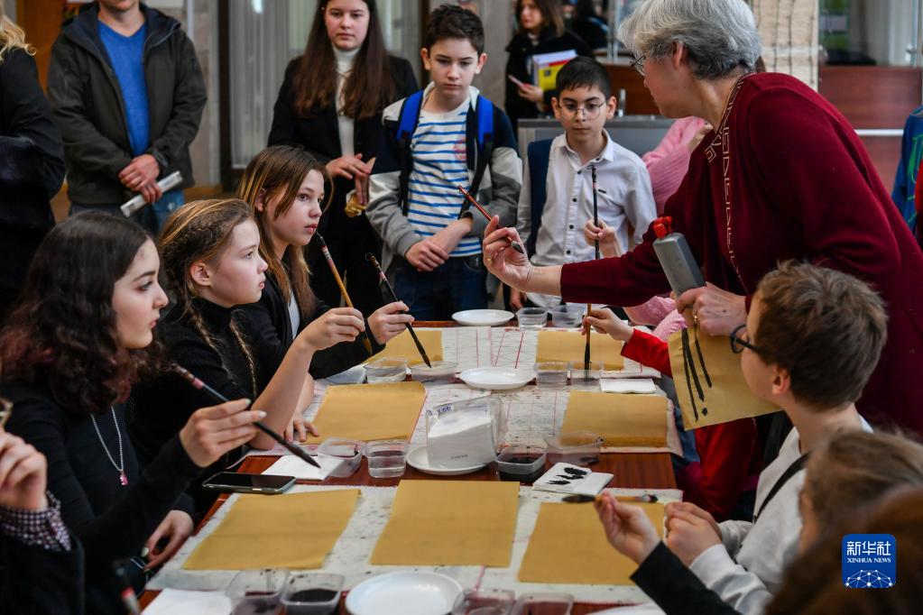 3月3日,中小學(xué)生們在俄羅斯莫斯科國際關(guān)系學(xué)院舉辦的“中國魅力”主題活動(dòng)上學(xué)習使用毛筆。新華社記者 曹陽(yáng) 攝