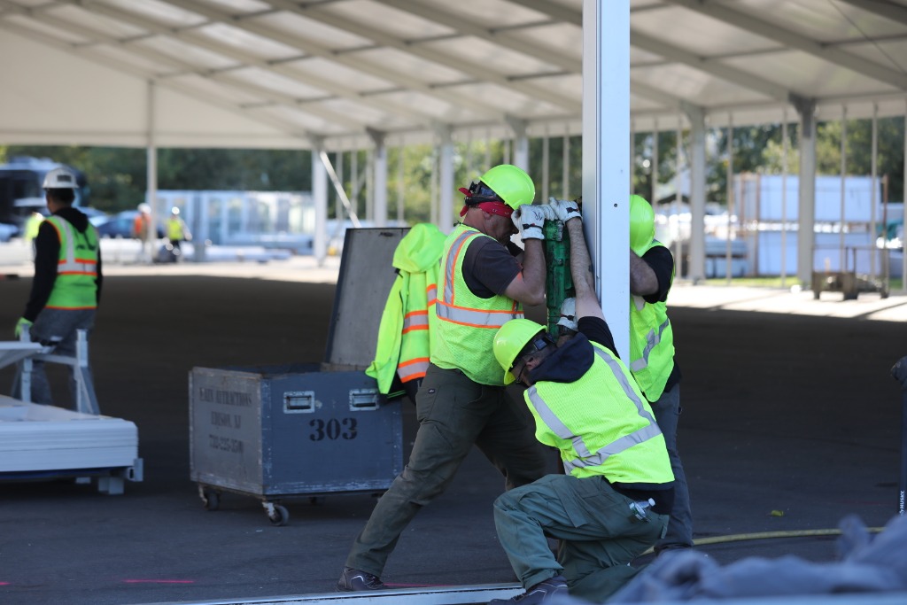 2022年10月9日,工人在位于美國紐約市蘭德?tīng)枍u的移民救援中心建設工地工作。新華社記者王迎攝