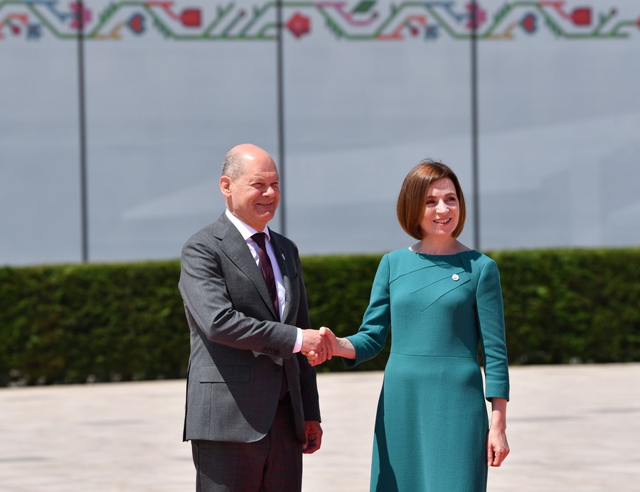 6月1日,在摩爾多瓦布爾博阿克,摩爾多瓦總統桑杜(右)歡迎前來(lái)參加第二屆歐洲政治共同體領(lǐng)導人會(huì )議的德國總理朔爾茨。新華社記者連漪攝