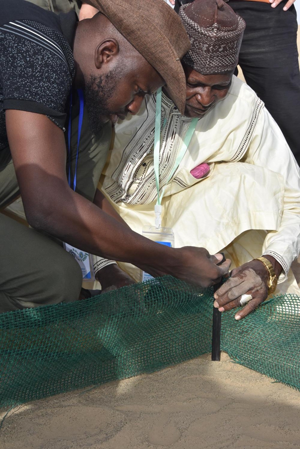 這位卡諾州環(huán)境部生態(tài)和林業(yè)主管按照中國專(zhuān)家的講授和示范,把條狀的可降解乳酸纖維沙袋灌滿(mǎn)沙子,擺成方格形狀,又拿起沉甸甸的鐵錘,把小樁子敲進(jìn)沙地里,圍上高密度固沙網(wǎng)。