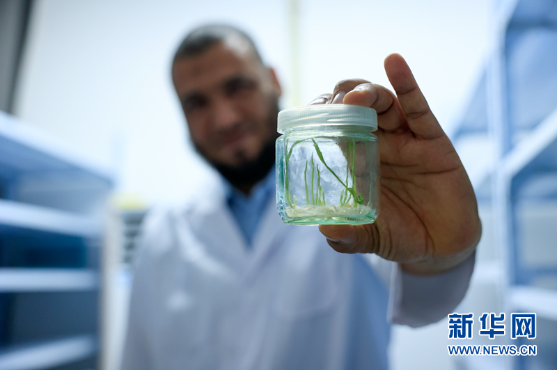 艾哈邁德·埃爾法納展示云南省農業(yè)科學(xué)院糧食作物研究所小麥新技術(shù)研發(fā)創(chuàng )新團隊培育的小麥單倍體苗。新華網(wǎng) 趙普凡 攝