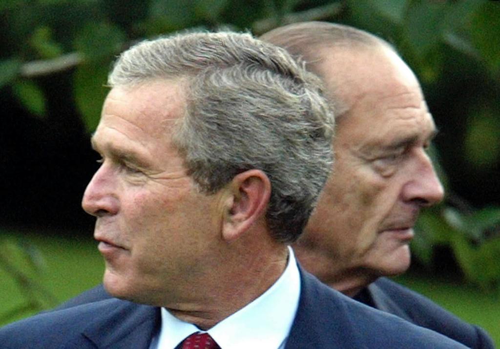 2003年6月1日,時(shí)任法國總統希拉克(右)與時(shí)任美國總統布什在法國埃維昂出席八國集團首腦會(huì )議時(shí)一個(gè)“左顧”,一個(gè)“右盼”。在對伊拉克動(dòng)武問(wèn)題上,希拉克堅決反對布什繞開(kāi)聯(lián)合國的做法。新華社發(fā)