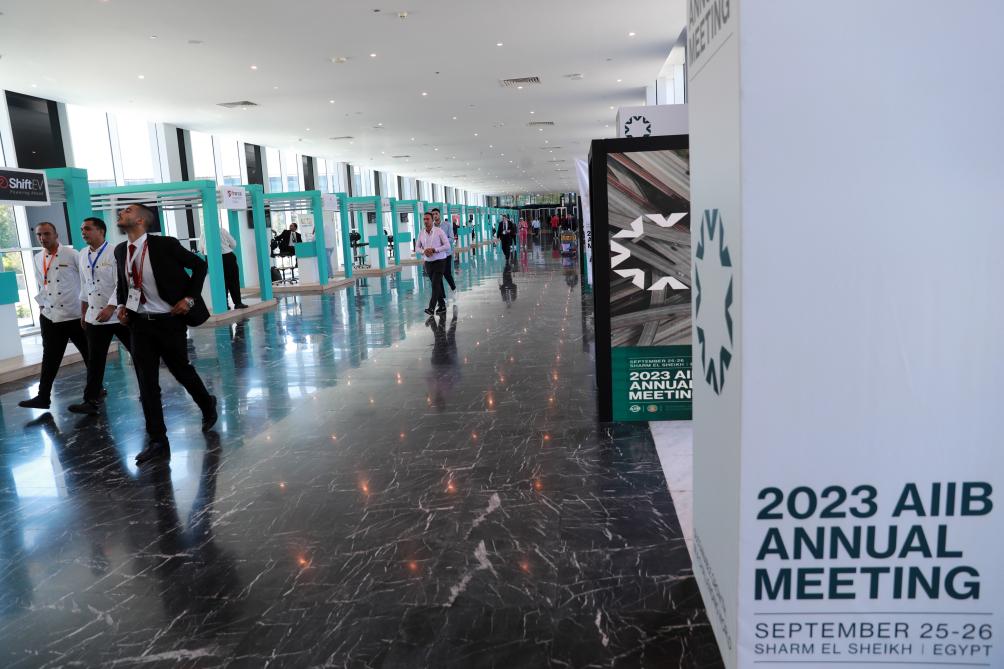 9月26日,在埃及沙姆沙伊赫,參會(huì )者走過(guò)亞投行第八屆理事會(huì )年會(huì )的展板。新華社記者隋先凱攝
